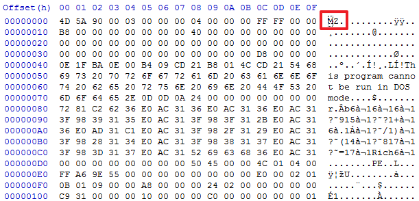 PE의 스펙에 맞게 '4D5A'의 2바이트로 시작하며 'MZ'가 보입니다. 그 다음으로